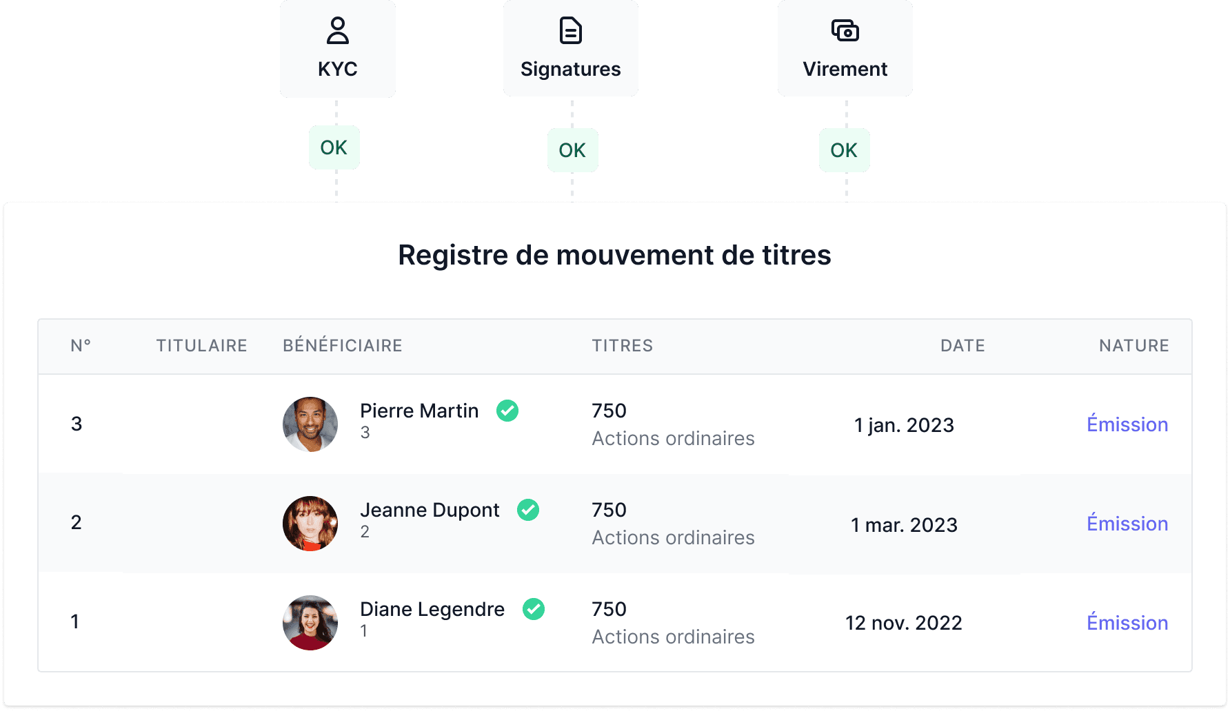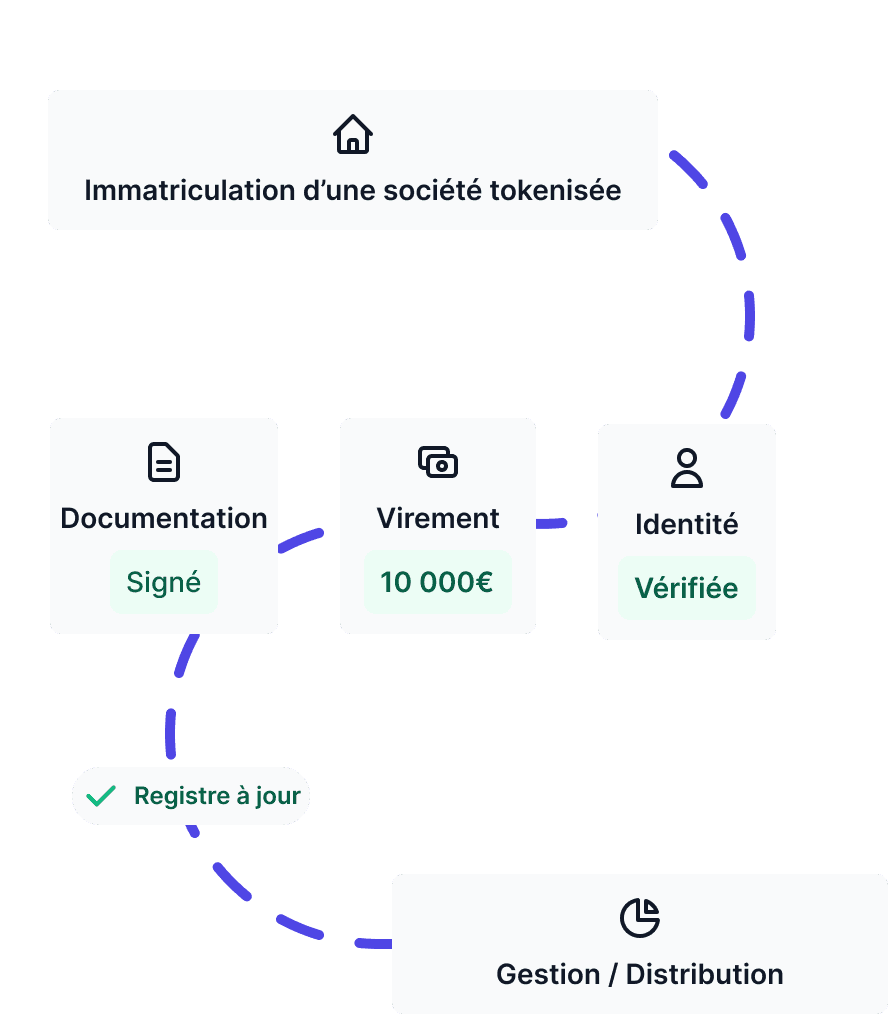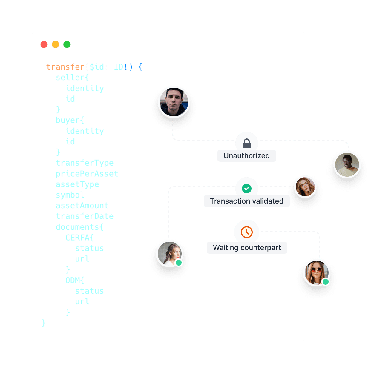 Structuration de vos smart contracts d'opérations, gestion des flux de cash, de titres et d'identités tout au long du cycle de vie de vos titres financiers (émission, gestion, échange), l'expérience en temps réel supprime toute intervention manuelle de reporting.