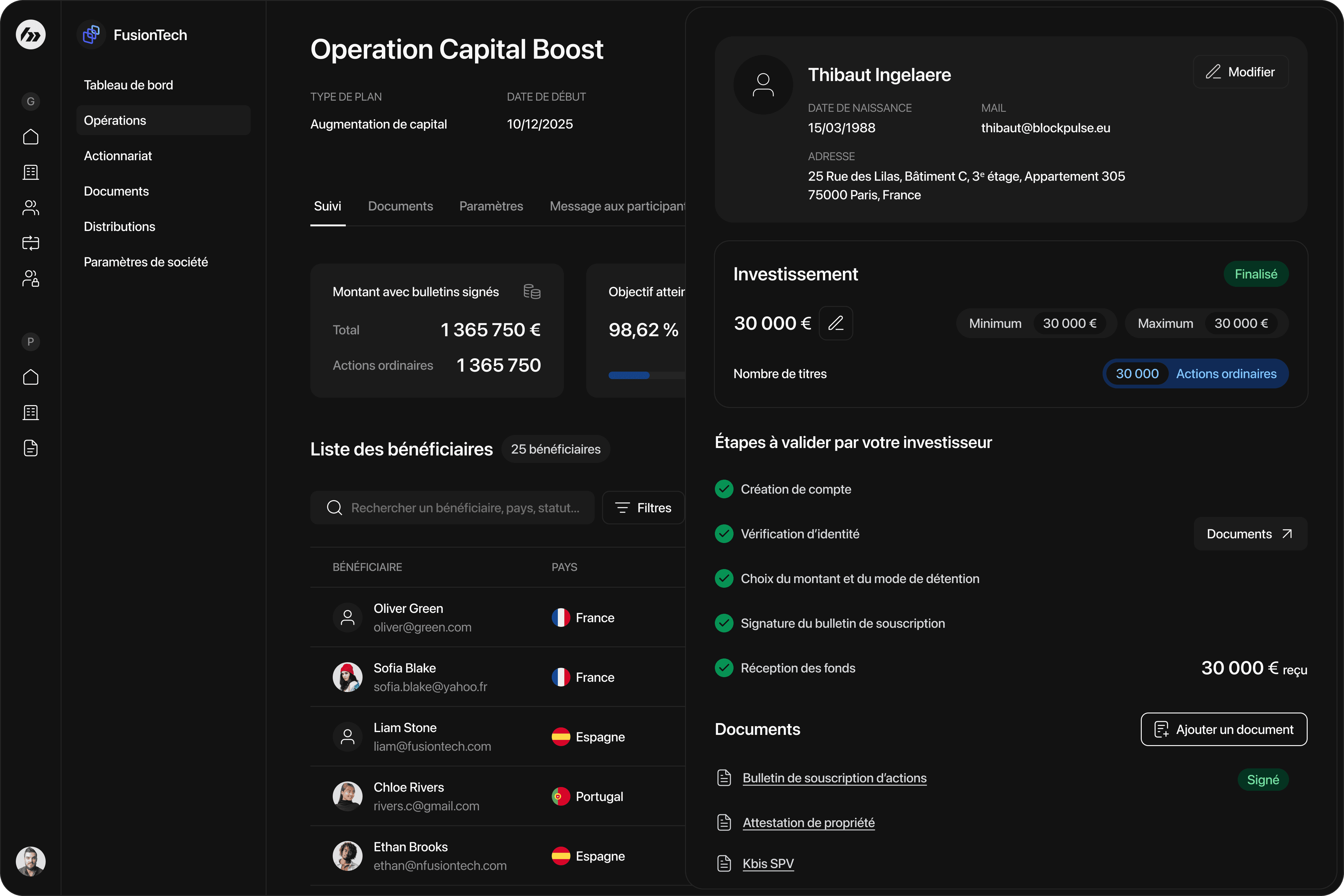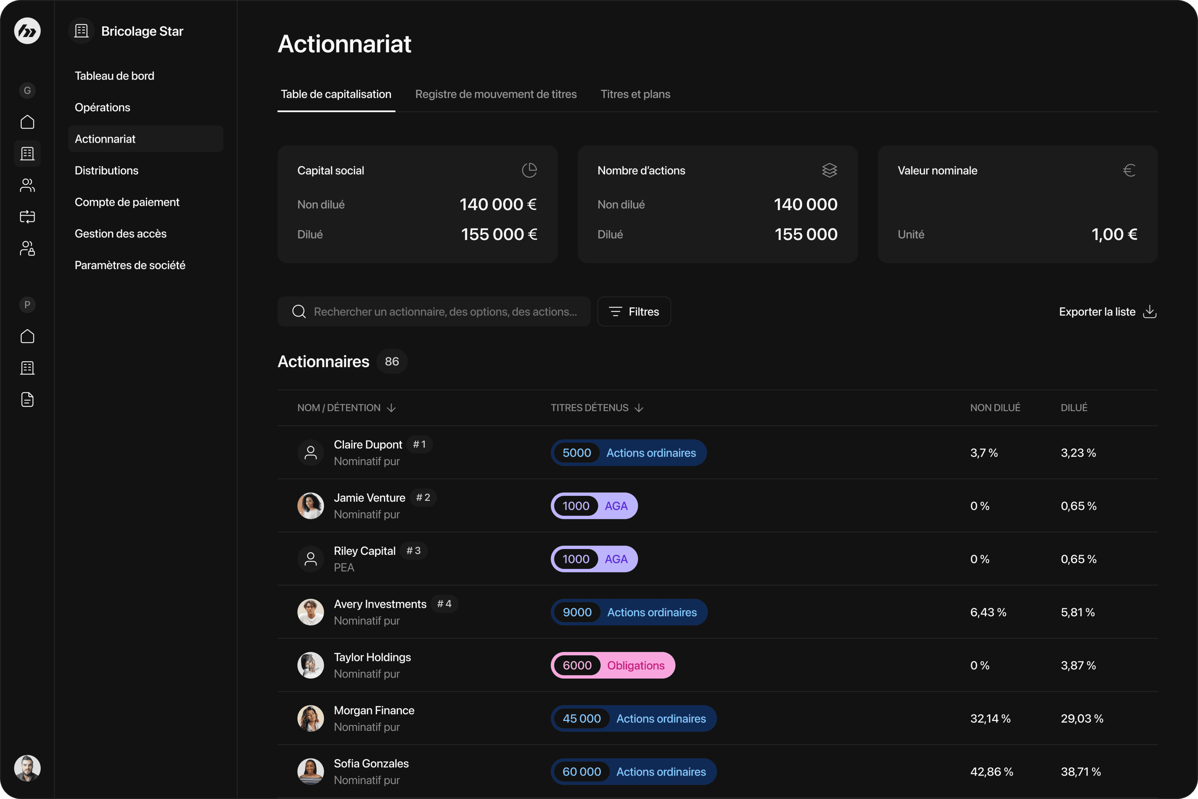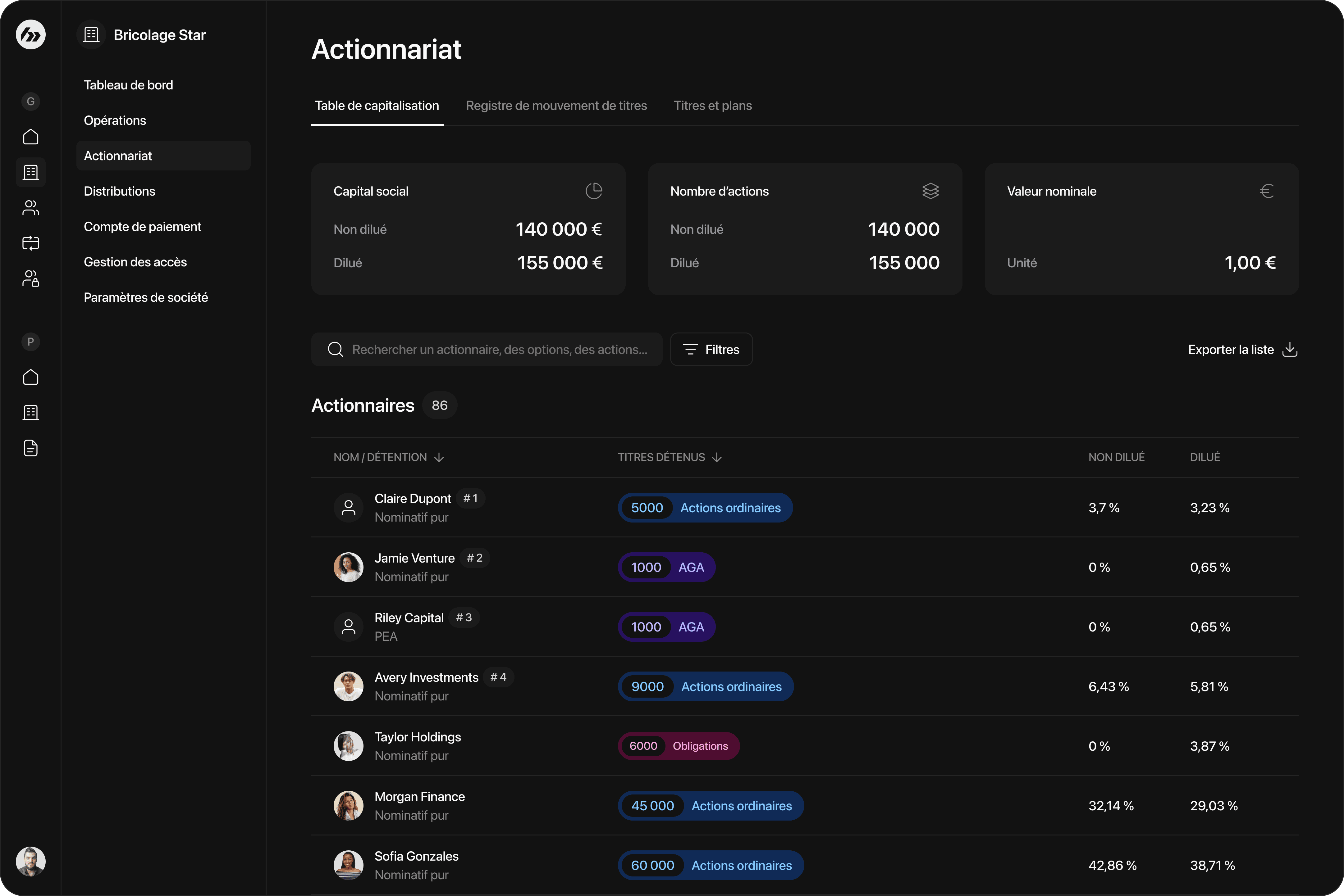 Un socle commun qui aligne données RH, règles juridiques et flux financiers dans un seul système pour transformer le partage du capital en projet collectif.